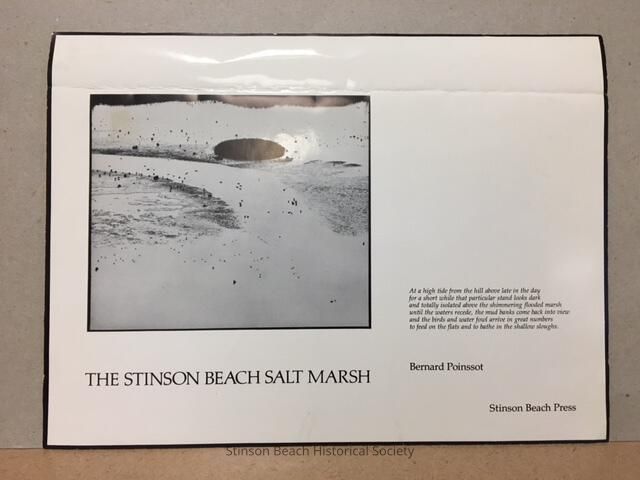This is most likely is a photo made on the occasion of the publication of a poetry book by Bernard Poinssot (see 2009L-100-01) for the book opening. It is possibly made to be framed and/or given out as a poster to take home. It is composed of one of the photographs of the salt marsh at high tide on the left with the poetry printed on the right. The title of the book, "Stinson Beach Salt Marsh" is written under the photo and his name, Bernard Poinssot and Stinson Beach Press are written under the poetry. The poetry is about the descriptive observations of high tide on the marsh grasses.Collection
