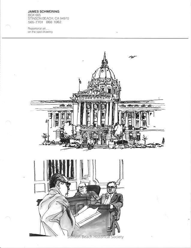 Copy of pen & ink drawing by James Schwering offering examples of his reportorial art/on the spot drawing. The upper drawing shows the outside of the San Francisco Civic Center building; the lower drawing the inside of a courtroom with a seated judge presiding over an interrogation by an attorney of a witness on the stand.Collection