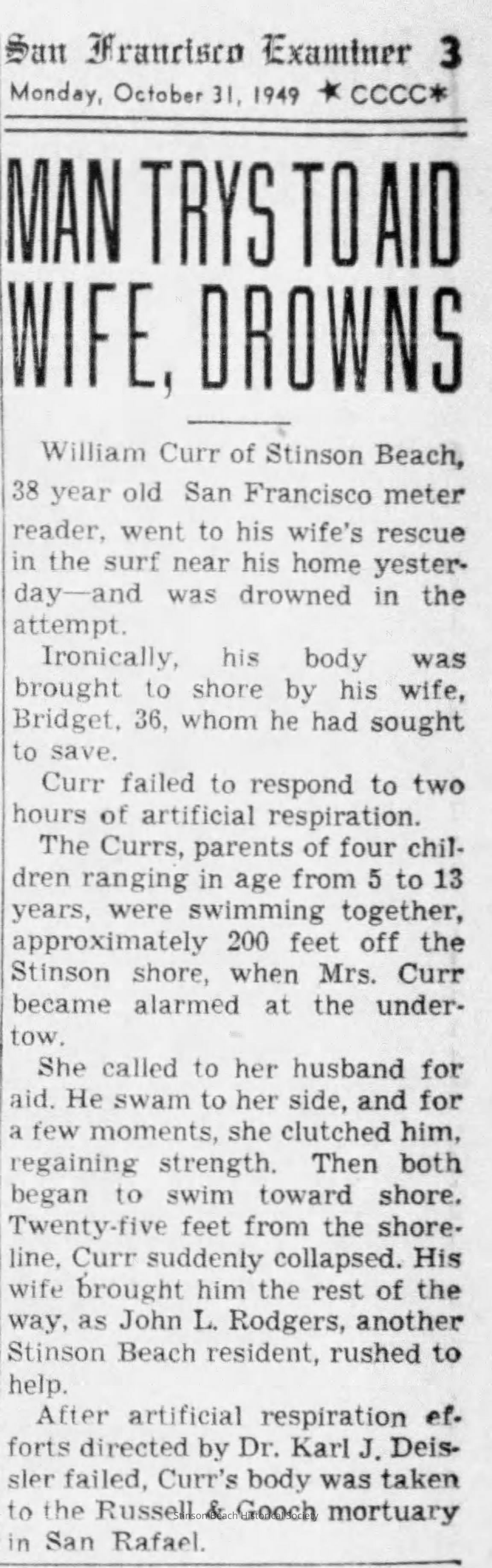 From San Francisco Examiner dated 10/31/49, similar article regarding the death of William Curr