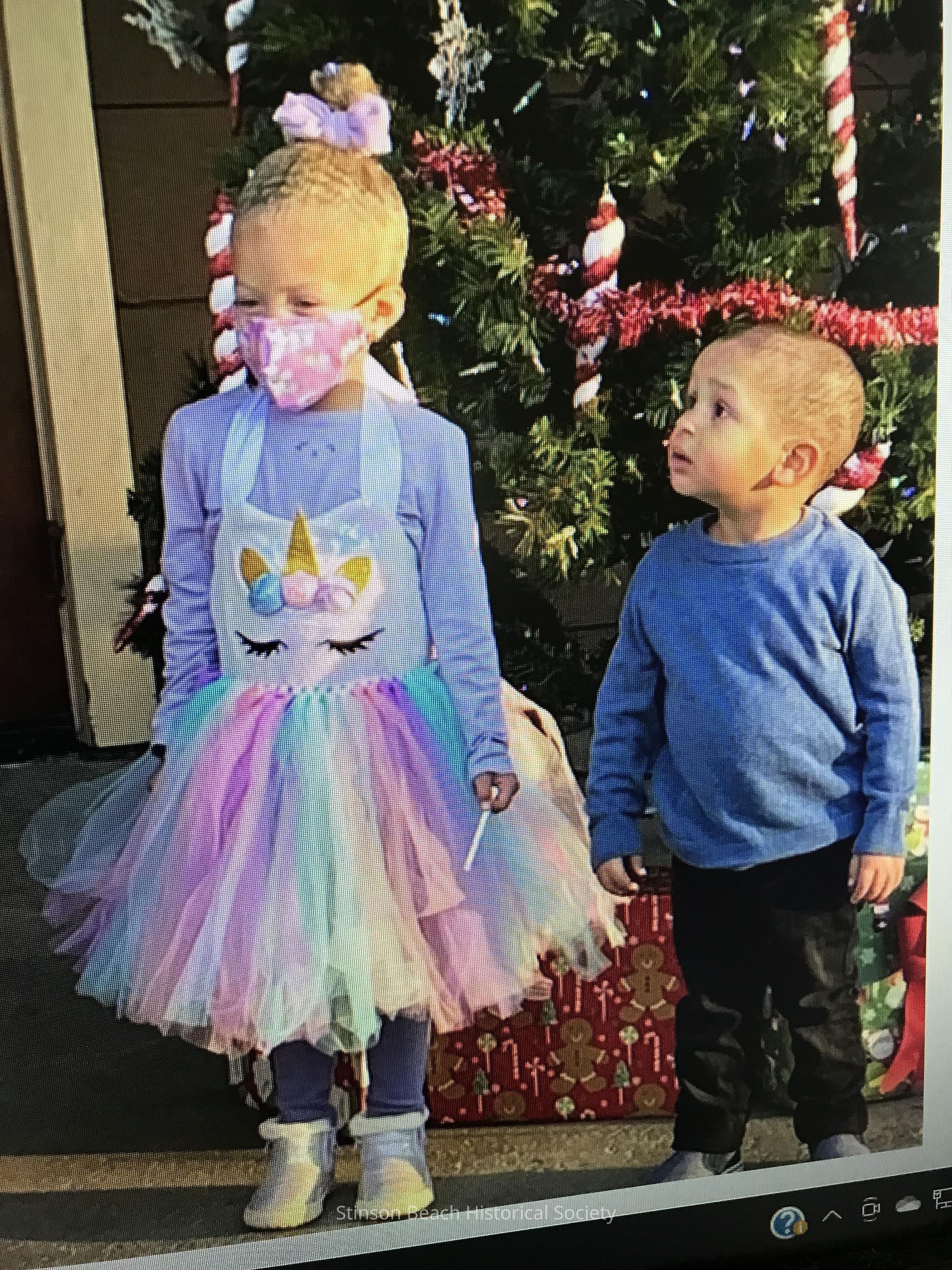 The Archibald children visiting Santa on the porch of the Community Center which has been decorated with Christmas tree and lights. Children are wearing masks due to Covid pandemicCollection