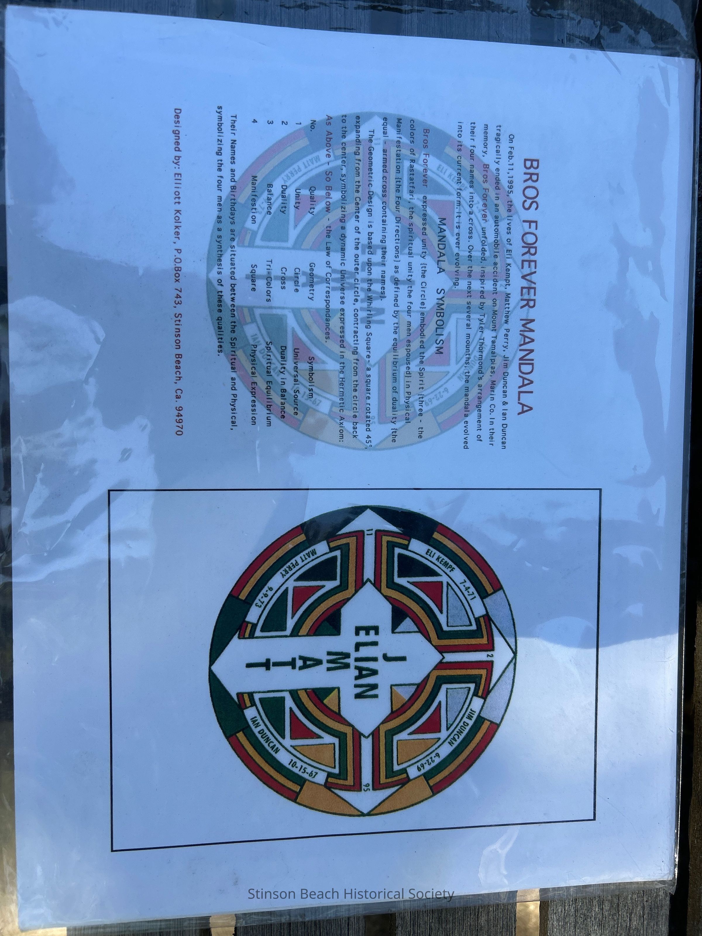 On February 11, 1995, 4 young local men died in a car accident on Panoramic. They were Eli Kempf, Matt Perry, and brothers Ian & Jim Duncan. There was a memorial for them and Elliot Kolker made the mandala. Subsequently, Eli's mother, Diana Morrell, made annual calendars and photo albums of their lives. Upon Diana's death, the artifacts were donated to SBHS