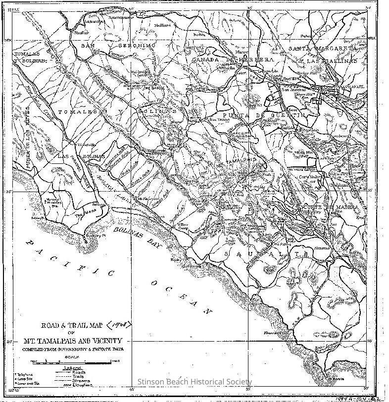 Road and Trail Map of Mt. Tamalpais and Vicinity published in 1908. It shows trails in dotted line and roads in double line, streams in dotts/line. Also shows telephones, camp sites, and convenience stations. Scale is 1 7/16 " = 2 miles. The highest elevation is 2604 ft. Shows Pacific Ocean coast from Bolinas to Pt. Bonita.Collection