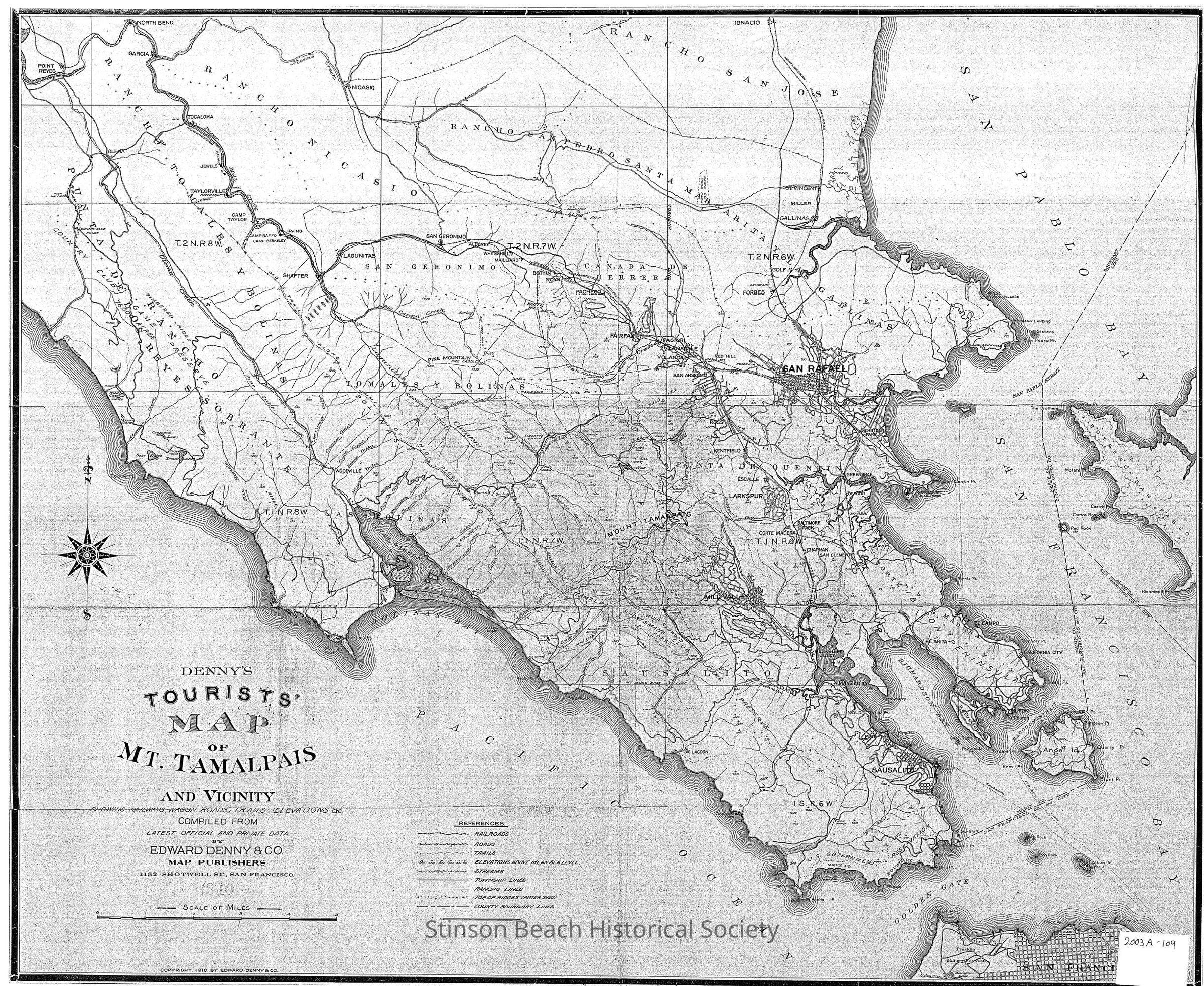 Denny's Tourist Map Of Mt. Tamalpias, Central and Southern Marin showing railways, wagon roads, trails, elevations, streams, and rancho lines.Collection