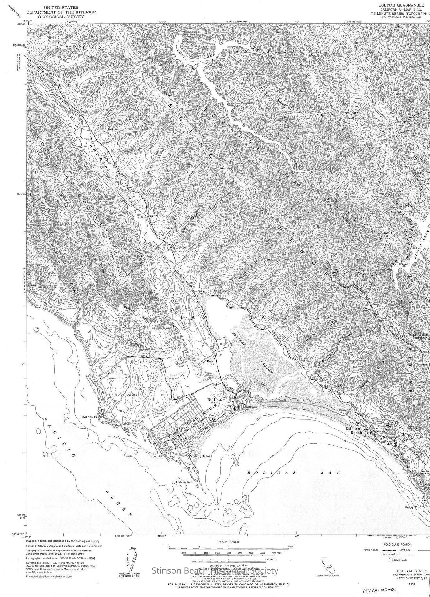 Map showing Bolinas, Stinson Beach, Bolinas Bay, Bolinas Lagoon, and San Andreas Rift.Collection