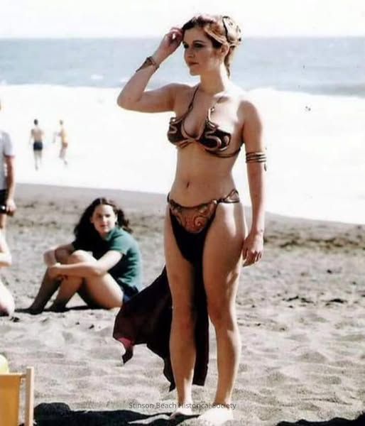 Star Wars had some scenes filmed on the beach in May, 1983. Here is Princess Leia (Carrie Fisher) awaiting her scene.