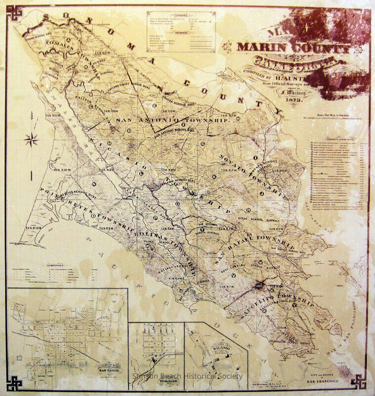 Map of Marin County printed in brown ink and mounted on cardboard. It identifies 8 townships exiting within the Marin County boundary in 1873 and many school districts within the townships. It also shows individual land holders by name and their subdivided site maps. It includes the usual roads, plus rail roads; statistics of: 1872 Value of real estates, value of personal property, total population in 1870, 1860 and 1850. It also shows relations to the Mexican Grants. Enlarged map of San Rafael, Tomales and Nicasio are at the bottom of this map.