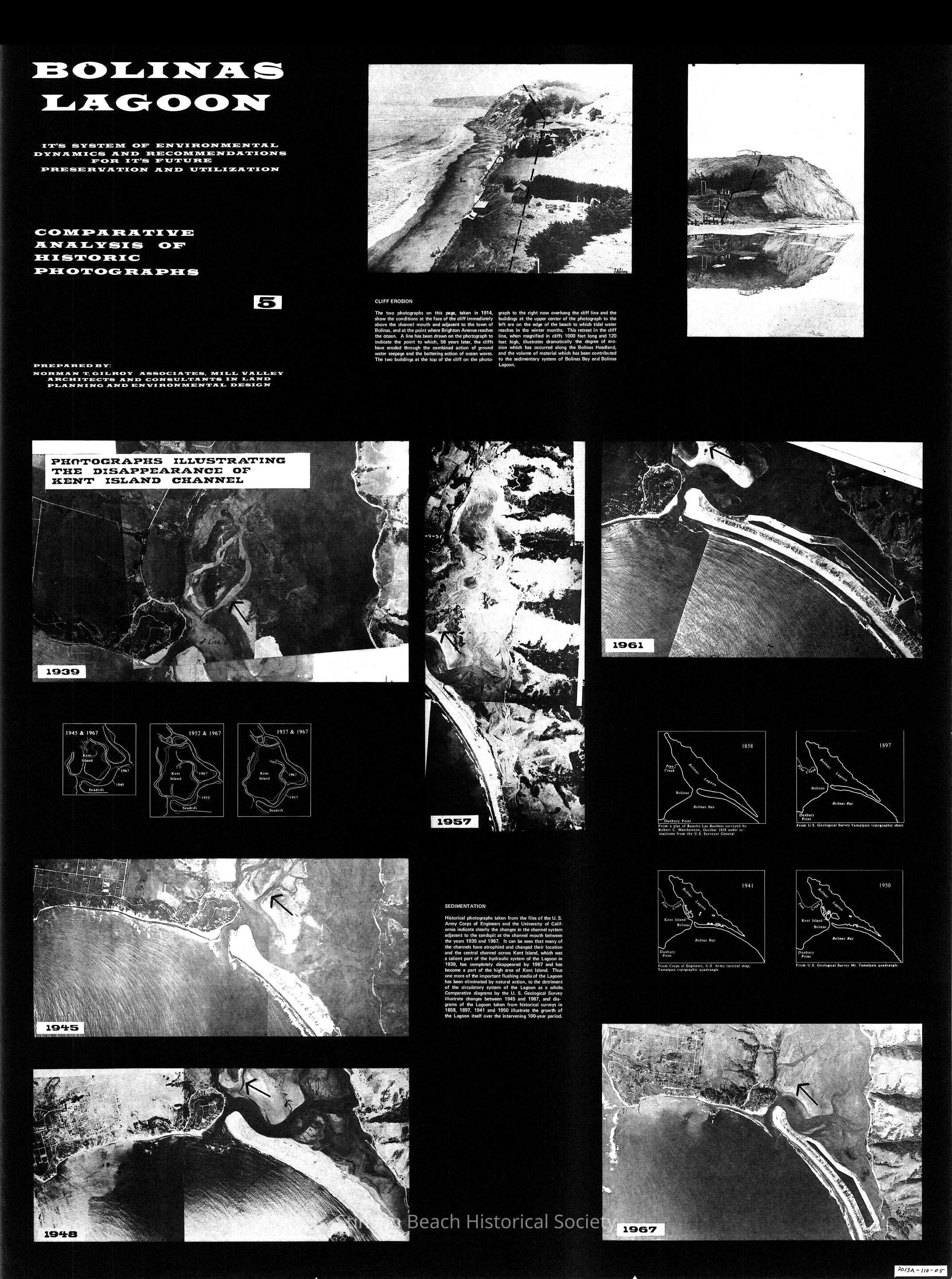 Photos and graphics illustrate the gradual disappearance of Kent Island Channel from 1939 to 1967, with particular emphasis on cliff erosion and sedimentation.