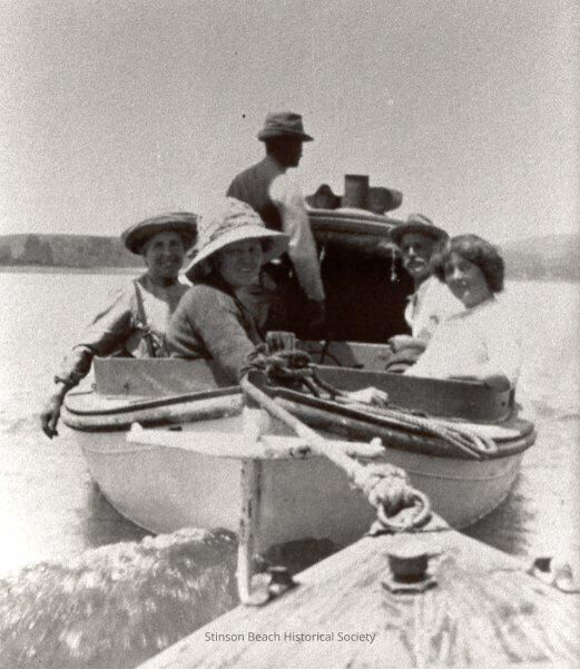 Black and white photo of the boat to Bolinas 1912. There are 2 prints in this accession. The people on the boat are L-R sitting: Edith Dunn, ( possibly) Margaret McKennon, Joseph Dunn, Eva Dunn; standing: Bill McKinnon.Collection