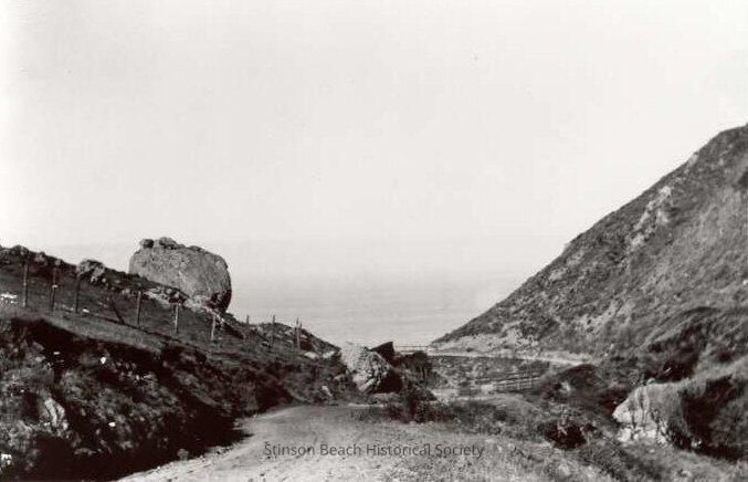 Black and white photograph of unpaved Outside Road (Highway 1), south of Stinson Beach, with embankments rising on both sides. This is close to Steep Ravine where a trail leads down to the beach and the Sulphur Hot Springs.Collection