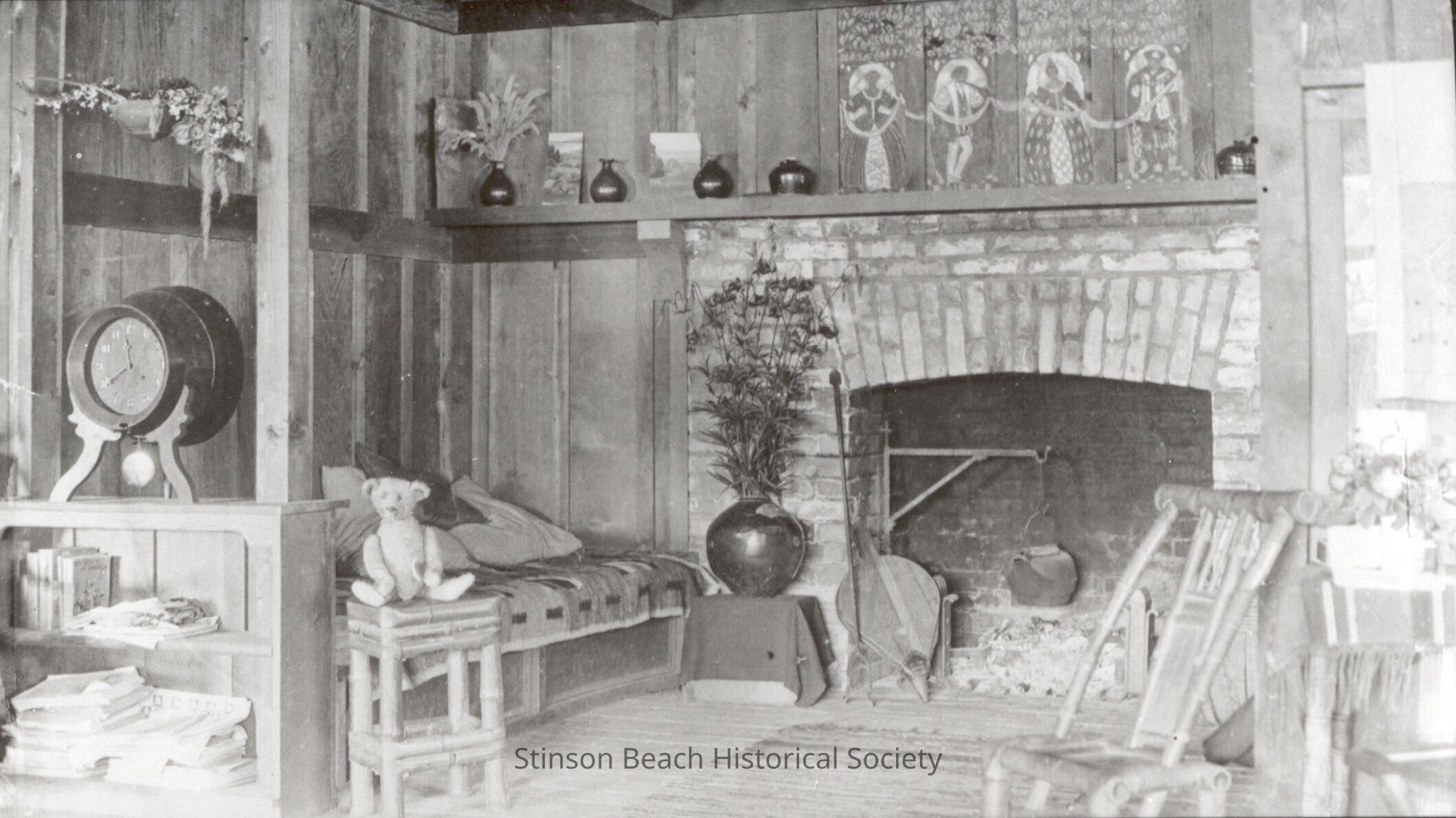 Black and white photograph of the rustic interior and the fireplace nook of a cottage. To the left of a brick fireplace there is a built-in bed/couch with throw pillows. The bed is enclosed at the outer end by a low, two-shelf bookcase with a clock, standing on the top shelf, that appears to be encased in a porthole. Next to it is a small stand with a teddy bear sitting on it. There are vases and a painting of male and female figures on the mantel shelf and bellows and a swivel hook with a tea kettle hanging from it in front of the fireplace. There is a small stand with a large round vase with a flower arrangement to the left of the fireplace. There is a handmade chair made of unstripped branches in the right foreground. See notes.Collection