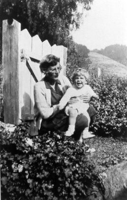 This black and white photograph is of a woman crouching in front of a gate holding a child of about a year on one knee. The woman wears glasses and is looking at the child who is looking at the camera. There is a shrub in he foreground and trees and shrubbery behind them with a hillside in the background. See notes.Collection