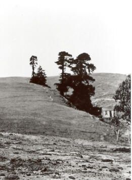 This black and white photograph shows a cabin tucked in a gully between two grassy hills. There is a tree to the right of the cabin and trees to the left of it, going up the gully. See notes.Collection