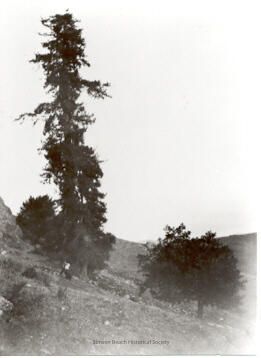 This black and white photograph shows a hillside with a very tall (75 to 100 feet), thin pine tree. There are some smaller (25 feet?) bushier trees nearby. There are two people on the hillside in front of the tree. See notes.Collection