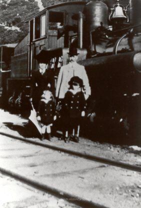 In this black and white photograph a man, woman and two children stand in front of a railroad engine. They are dressed in late 19th/early 20th century style. The woman wears a dark, long skirted dress or suit and hat and holds a parasol. The mustachioed man wears a light suit and a high bowler hat. The children, standing in front of them, are dressed alike in dark, double breasted jackets over white, possibly sailor style blouses. They appear to be about 4 and 7 years old. The engine behind them is old fashioned with a wooden cab and a water/steam tank and bell in the front. There are tracks in the foreground. See notes. See #1993-126-01.Collection