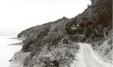 In this black and white photograph there is a road leading away from the camera with a steep hill and rocky outcroppings rising on the right and shrubs and patches of sand making up a shoreline on the left. This is the Lagoon Road between Stinson Beach and Bolinas, facing North toward Bolinas.Collection
