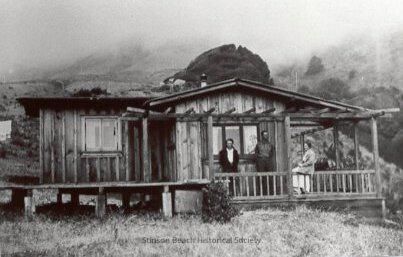 Doughty family on the porch of Doughty family cottage on Laurel Street taken by Gertrude Dunn Bruce. This black and white picture shows the south side of the house with the foggy hill and a Laurel tree behind. The house is rustic with wood siding and a porch/deck with a wood railing enclosing the front and side of the house. A back wing has no porch. Two men stand on the porch facing the camera while a woman sitting on the railing is in profile.Collection