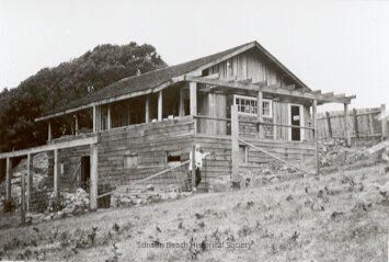 In this black and white photograph we see a house built out over a hillside. The lower portion is enclosed with wood siding with a few small windows and a door. The upper portion of the building, the living quarters, has a porch running the length of the house with a solid railing, made up of the actual siding of the house, and covered by the extended overhang of the roof. The porch extends around the end of the house where the railing is open and a window and a door can be seen. There is a wood fence running along the uphill length of the house and an open wire fence running downhill from that. At the lower left of the picture there is a wooden framework that could be some sort of arbor or the start of an outbuilding. A man stands by the wire fence in front of the building. There is a tree behind the house and grassy hillside in the foreground.Collection