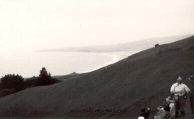 A black and white photograph of a hiker's first view of ocean when hiking from Mill Valley on Dipsea Trail. Shows Stinson Beach and Bolinas in background, the hills and the trail with people (Bibbens and Dunn families) in the lower right hand corner.Collection