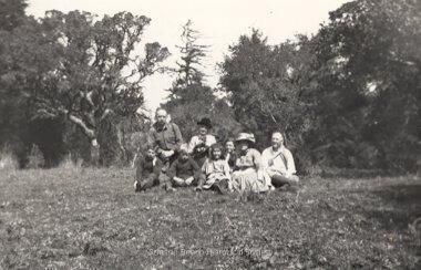 A black and white group photograph of hikers. There are four adults, two men and two women, and four children (two boys and two girls) sitting in a meadow in front of some trees. The men and children are hatless. The two women are wearing shade hats. See notes.Collection