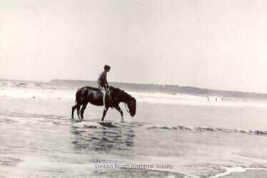 A black and white photograph of a man riding a horse in the surf. The horse's head is bowed toward the water. See notesCollection