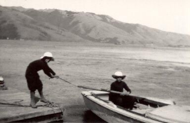 A black and white photograph of 2 boys, Dick and Robbie Dunn, at McKinnon's Landing pulling a rowboat to the dock. Robbie is in the boat and Dick is on the dock. Hills toward Highway One are shown in the background.Collection