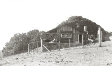 This black and white photograph is of a house on a hillside with trees in the background. The house has wood siding and a covered porch running along one side (facing the ocean). There is high wire fencing circling the house.Collection