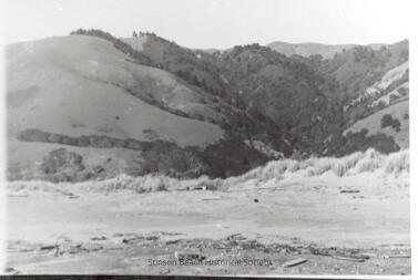 A black and white photograph of Stinson Beach Sand Spit looking toward Stinson Gulch. The foreground is sand dunes topped with dune grass. Behind the dunes are grassy hill sides converging in a tree covered gulch.Collection