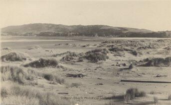 A black and white photograph of sand spit of Stinson Beach at the mouth of the lagoon, taken 1937, shows sand with clumps of dune grass in the foreground and hills in the background across a body of water. You can see the downtown Bolinas across the channel. An original (displayed) and a copy of the original, 3 partial photographs are cataloged.Collection