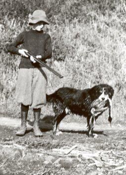 This black and white photo is of a boy and a dog. The boy wears a floppy brimmed hat, a dark sweater, knee pants, boots and carries a shot gun. The dog (black with a white nose) stands beside him with a duck in his mouth. Photograph of Robbie Dunn with Bum (Airey dog).Collection