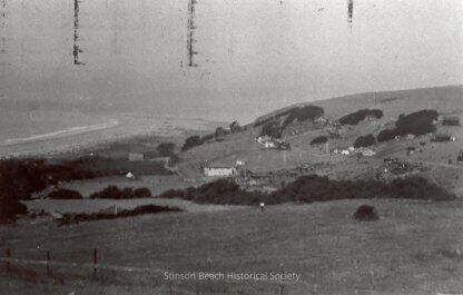 Photograph is a panoramic view hillside with a scattering of houses and trees and the curve of Bolinas Bay on the left with a ridge almost obscured by fog beyond. It is Stinson Beach (Willow Camp) taken from the hillside by White Gate Ranch.Collection