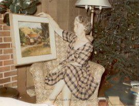 In this color photo of Mildred Sadler she is holding a picture of Stinson Beach School, 1966. The picture was a gift from her husband Lester on the year she retired. She is in front of a fireplace wall in their home. There is a Christmas tree in background.Collection