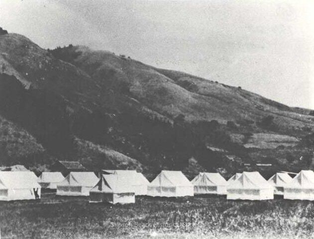 This black and white photograph is of the tent village on Upton Beach on the Calles. Noted on the back, "1910-1920, Willow Camp Tents, at Upton Beach (The Patios)". There are about 12 tents and the roof of the Charles Lauff cabin is visible behind the tents. In the background are the hills toward Panoramic Highway. see notes.Collection