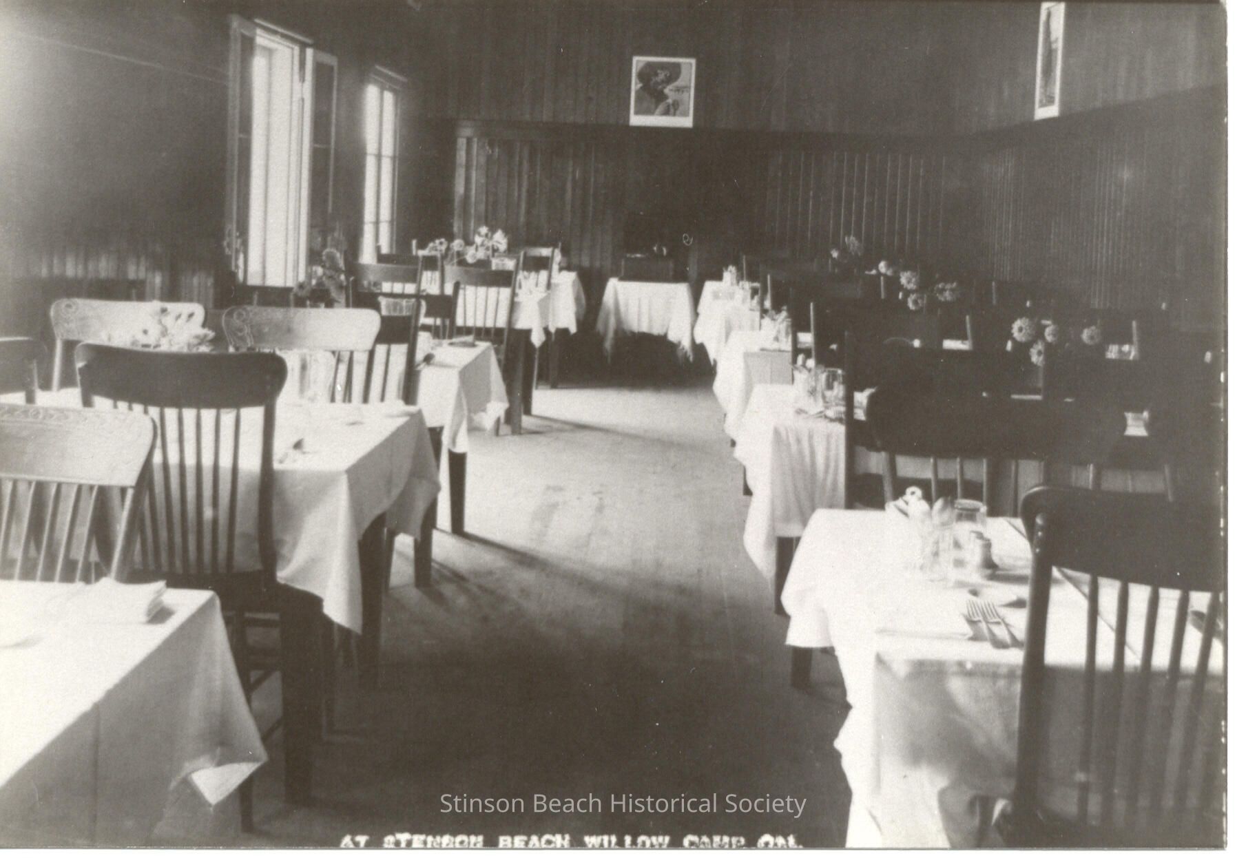 This B&W photo shows tables set for diners. It is a photograph of the interior of the Airey Hotel dining room. The kitchen was located behind the wall with the photographs and wood burning stove. See notes 1993-160-01.Collection