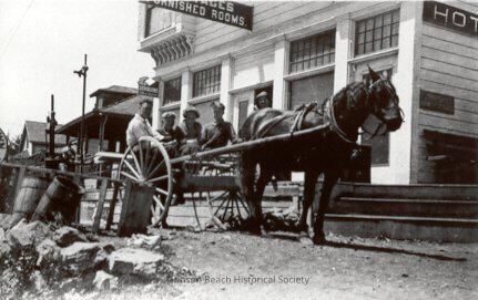 This black and white photograph is of a horse drawn cart in front of a building (the Airey Hotel). There are four people seated in the cart (Frank Airey on the left, Hoyt Sherman on the right with 2 unidentified people). A wooden box and 2 empty barrels are in front of the wheel. There is a woman standing in the doorway of the hotel. Partial hotel signs as well as Zerolene sign can be seen on the building. There are two other buildings on Highway One in the background (Hinzel and Fitzhenry houses).Collection