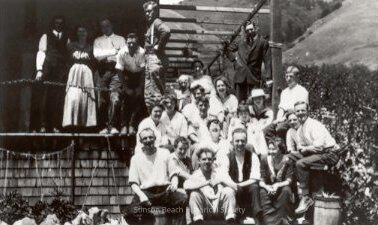 A black and white photograph of the Nielson Family gathering on the deck and under the covered porch. Nielson family house called "Laffalot" is located at 1 Belvedere in Stinson Beach. About 20 people are in the photograph.Collection