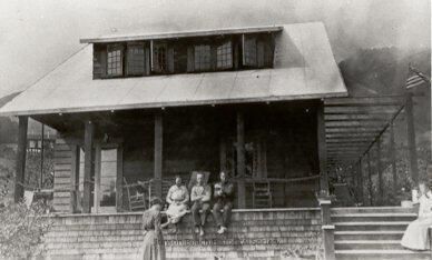 A black and white photograph of the Neilson family house called "Laffalot" located at 1 Belvedere in Stinson Beach. There is a deep overhang over the front of the house with dormer windows running almost the length of the roof. There are 2 men and 1 woman sitting on the front porch with a woman standing in front of them, facing them. There is another woman sitting on the wall of the steps to the far right. The people are unidentified.Collection