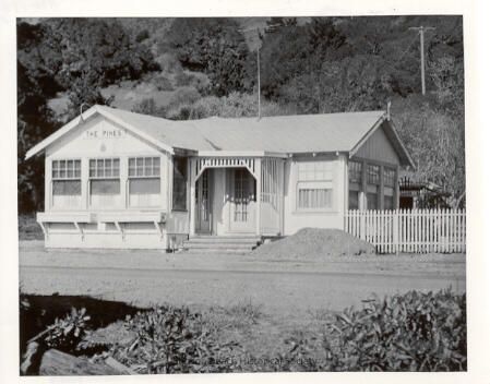 A black and white photograph is of an L shaped building. The ends ovate L are identical with three windows, the upper parts of which are comprised of 8 small panes, under a peaked roof. In the middle, at the elbow, is a latticed entryway leading to a French door next to another multipaned window. Beneath the gable facing the camera is a sign 'THE PINES' with a pine cone underneath and empty window boxes beneath the windows.. There is a pile of dirt beside the entry steps and a picket fence going off to the right of the building. A dirt road runs in front and a shrubby hillside is in back. "The Pines" Tea Room was located along Bolinas Lagoon, at McKinnon's Gulch, run by Mrs. McKinnon. The date written on the back,Feb. 18 1958, is probably the date the photo was received? Also written on the back "Tea room operated by Mrs McKennon 1920's L.Airey" . Original.Collection