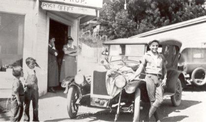 In this black and white photograph Frenchy Gales stands against a car (Model A ?). A hunting gun is propped against the radiator of the car. A double horned mule deer's head and pelt is draped over the corner of the hood of the car. The car is parked in front of the Post Office (Algar Store) on Route One (now the real estate office). There are 2 children and 2 ladies admiring the trophy. One other similar car is parked behind. Date unknown. Not original.Collection