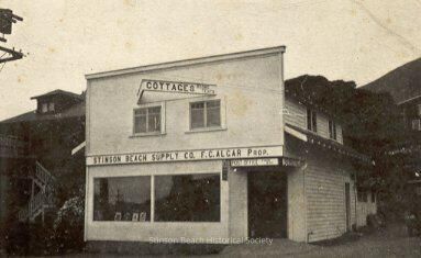 This black and white photo postcard is of a two story building. It has two large picture windows stretching across the lower part with a corner entrance. There is a false front on the upper story with two windows. There is a sign projecting above the upper story windows saying 'COTTAGES' and a sign across the front of the building, above the downstairs windows, reading 'STINSON BEACH SUPPLY CO. F.C. ALGAR Prop.' There is a smaller, right angle sign, over the corner entry, reading 'POST OFFICE, Stinson Beach' on each angle. It is a picture of the Algar building which stood on Highway One, now a real estate building. The dark-colored building next door (still in existence as Meristem - flowers and gifts), is also shown . The post card is original. It is printed by Pacific Novelty Co., San Francisco and Los Angeles.Collection