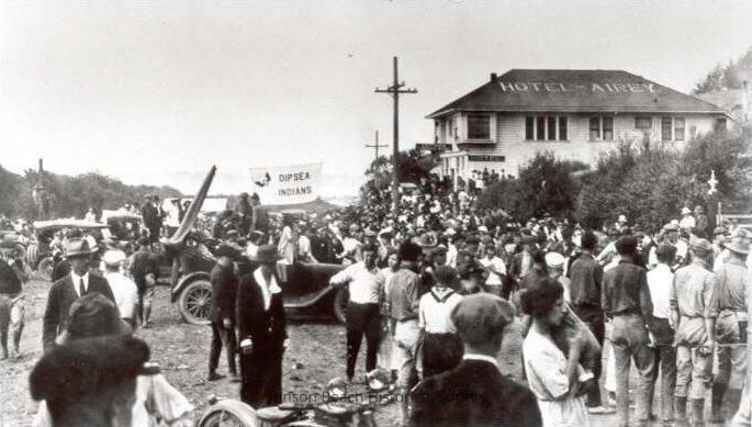 In this black and white photograph we see a crowd of people gathered in a clearing at the foot of a large white building with the words HOTEL AIREY on the roof. Three cars are parked among the people and the top of a motorcycle is visible in the foreground. There is a banner reading DIPSEA INDIANS. The event is the end of Dipsea race in front of the Airey Hotel.Collection