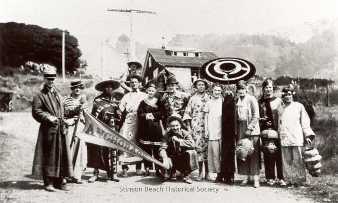 Black and white photograph of people dressed in costumes with an "Anchorage" banner, probably one of their parades. They are standing in front of the Anchorage house on Buena Vista. Louise Airey is the fourth person from the right. The rest of the people are unidentified. See notes.Collection