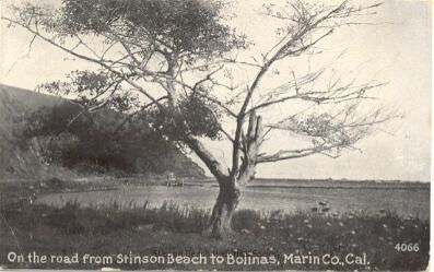 A black and white postcard with the words printed on the bottom "On the road from Stinson Beach to Bolinas-Marin Co., Cal." shows the Bolinas Lagoon. An oak tree with wildflowers is in the foreground and a hill and causeway (to the Sandspit) is in the background. On the right hand lower corner of card is #4066; on the back "Pacific Novelty Co. San FranciscoCollection