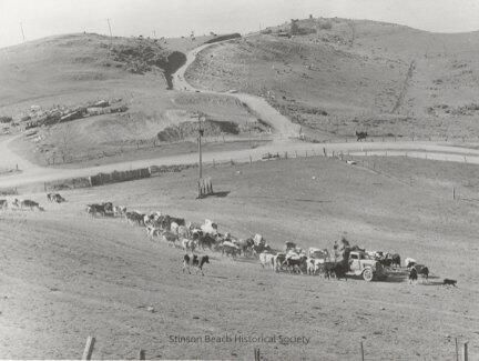 This black and white photographic print depicts the feeding cattle at White Gate Ranch. There is an old truck (right foreground) dropping bales of feed, with two to three dozen cows trailing behind. There are two unpaved roads in the background.Collection