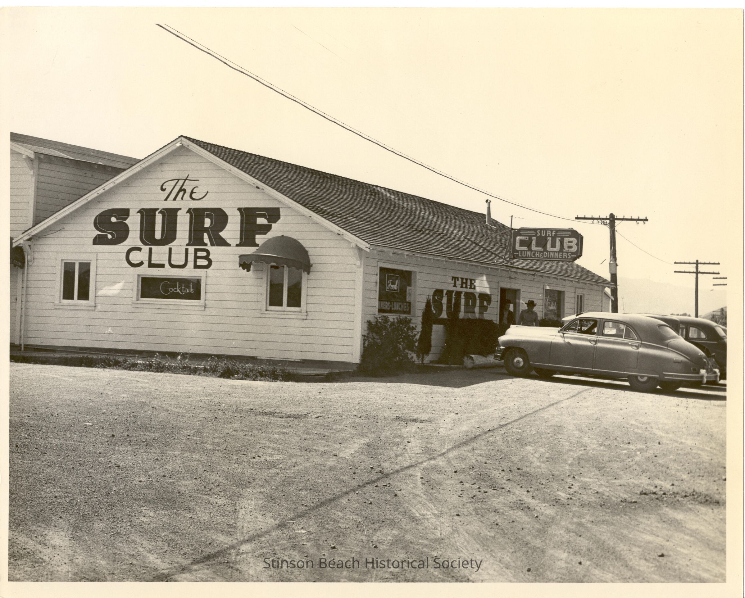 This black and white photograph is of a long, wood siding, one storey building. There are painted signs on the end and the entry side reading 'The Surf Club' and also a free standing sign on a pole on the roof reading 'Surf CLUB lunch & dinners'. There are some minimal plants and shrubs along the side of the entry. Two cars are parked in front. At the back of the building a two story annex is partially visible.