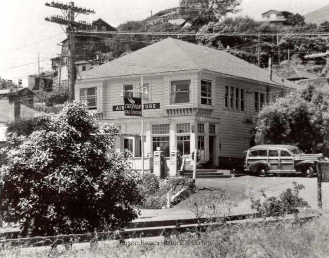One of 3 photographic prints of downtown neighborhoods, Airey's store with 2 Chevron gas pumps in front and Marble apartments on right. Station wagon parked on the side near the steps into the corner store.Collection