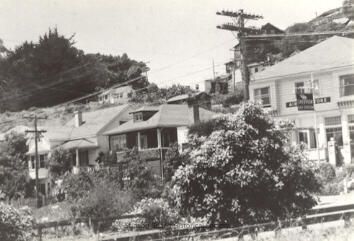 This black and white photograph is at the corner of Calle del Mar and Highway l showing Airey's store with old style gas pumps in front. Two neighboring houses and at least eight structures show on the hill above. Trees and bushes are well developed by this time and electric wires seem to reach high up the hill.