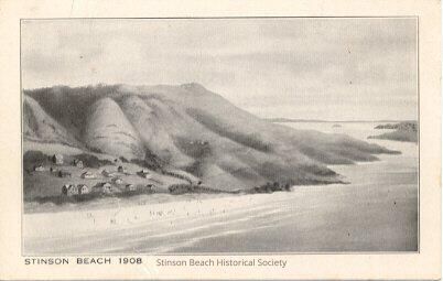 This black and white postcard is an artistic rendering of Stinson Beach. It depicts coastal hills, some houses nestled in the foothills and a broad beach with figures and waves. "Stinson Beach 1908" is written in the left lower margin.Collection