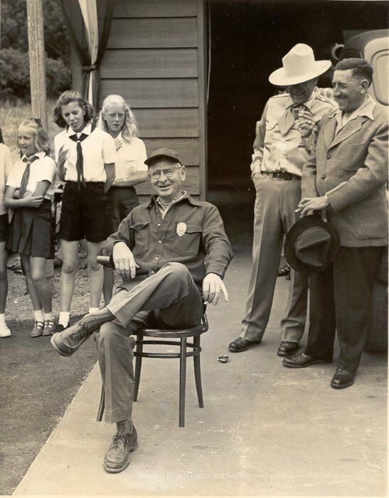 A black and white original photograph of Volunteer Fire Department, part of Stinson Beach Fire Protection District. The first Fire Chief, Will Airey, sits in front of the Fire House on Dedication Day, 1949. School girls in uniform stand on the left and volunteer firemen stand to the right. The girls, left to right, are Lola Mancha and Joan Dittmar. The standing men, left to right, are Elting Hubbard, Manuel Fostine.Collection