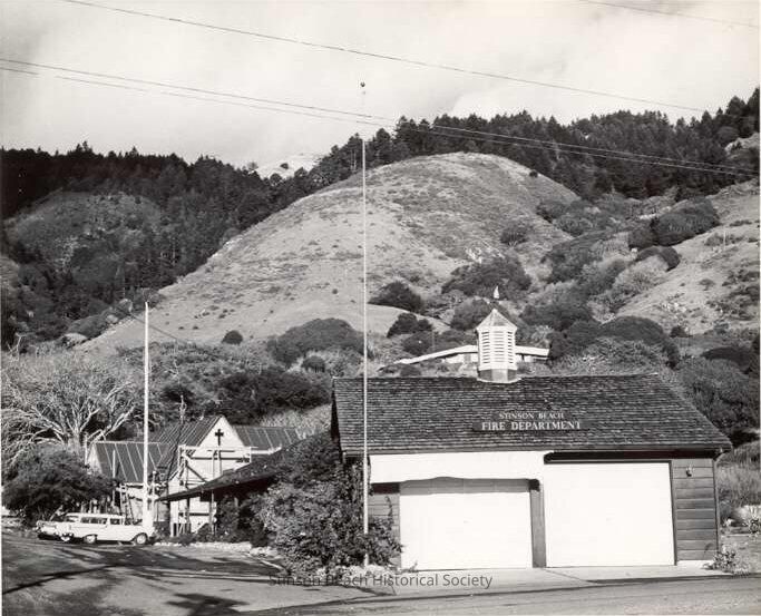 Firehouse and Community Center building completed with church in process. The building in the foreground has the sign "Stinson Beach Fire Department". There are two automobiles in front of the Community Center building to the left and left of that the church building is being completed. One residence shows on the wooded hillside above the roof of the Firehouse.Collection