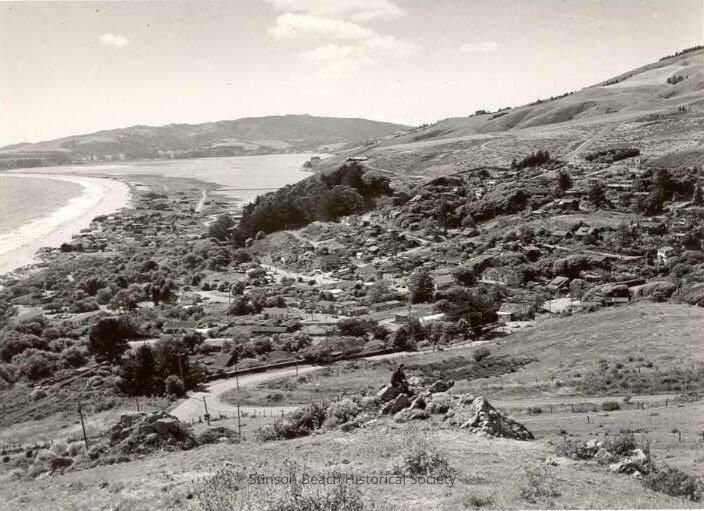 Panoramic view of Stinson Beach in 1952 taken from above the intersection of Hwy 1 and Panoramic Hwy. Undeveloped sand spit, full causeway and all the buildings are visible. Bolinas Bay and Bolinas Lagoon are seen in the upper left hand of the picture with Bolinas ridge behind. Houses are on Old Town Hills (Stinson Development, 1906), the roads and a couple of houses are in Highlands area. Panoramic Highway snakes through in the foreground.Collection